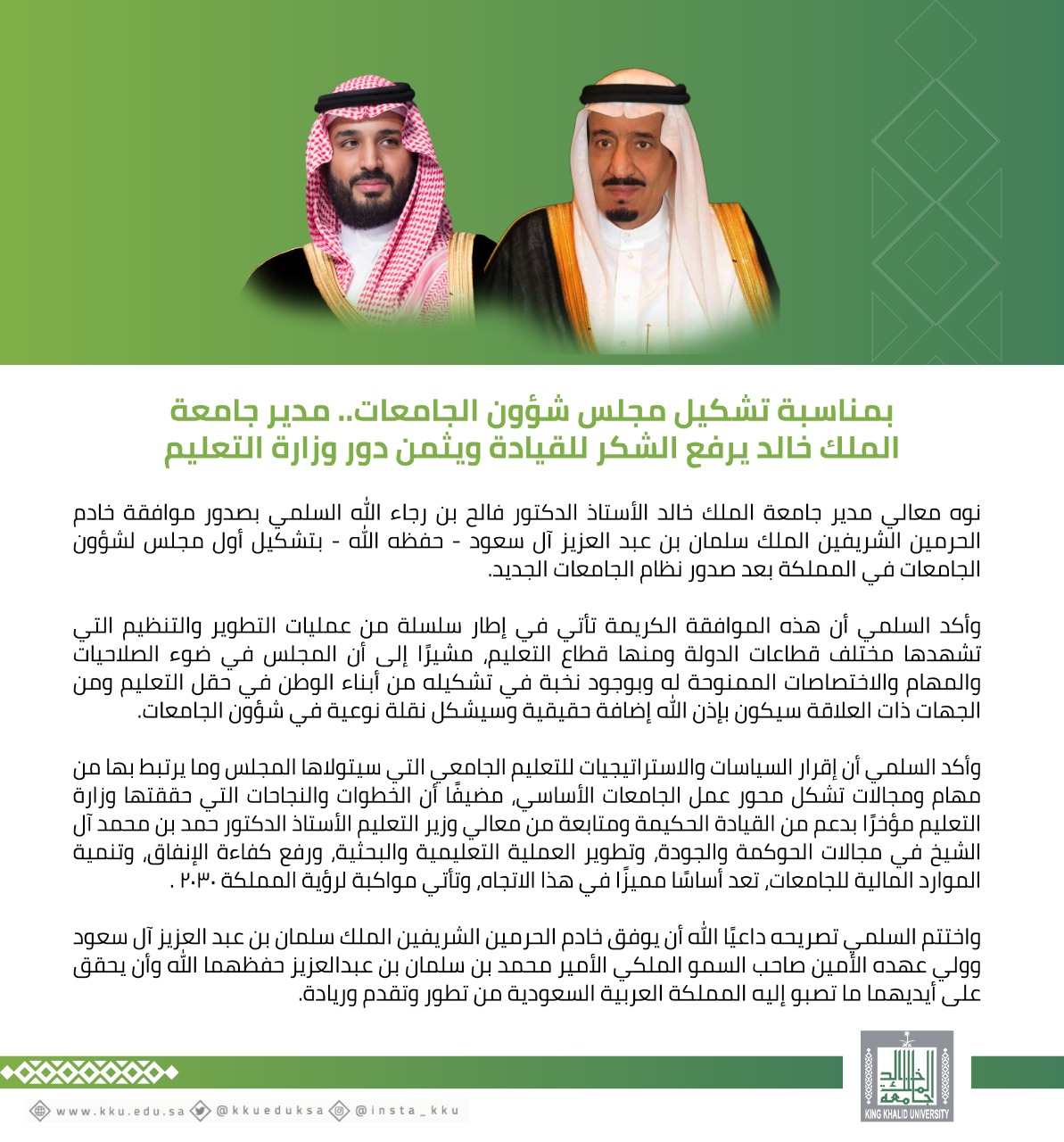 جامعة الملك خالد On Twitter بمناسبة تشكيل مجلس شؤون الجامعات مدير جامعة الملك خالد يرفع الشكر للقيادة الرشيدة ويثمن دور وزارة التعليم Https T Co Voslwygmae Https T Co Q93ueglda5